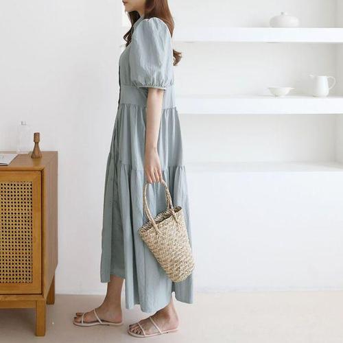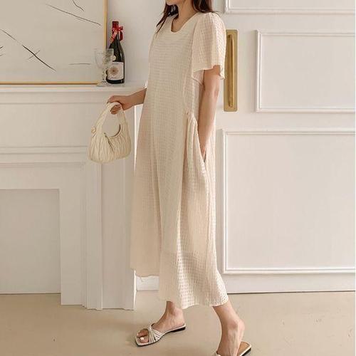 [에이치플러스몰]루즈핏 편안한 리치카라 반팔 롱 원피스