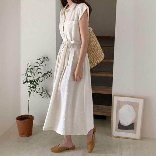 일이오 여성 베이직 셔츠형 허리끈 롱 원피스