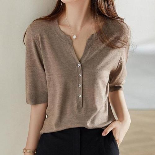 [엄지척]여성 여름 라운드 브이 넥 반팔 기본 니트 티 브라운_19682099_667501
