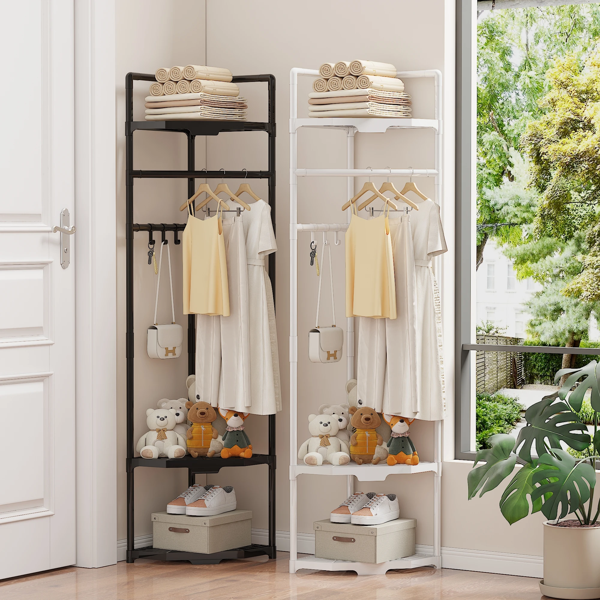 1단/다층 금속 옷걸이(후크 포함)/스탠딩 옷걸이, 특수 코너 수납 선반, 다기능 신발 및 액세서리 수납 선반, 침실 또는 거실에 적합, 흑백 디자인, 코트, 재킷, 모자 및 열쇠/장식품 전시에 적합, 삼각형 코너 장식 수납 선반