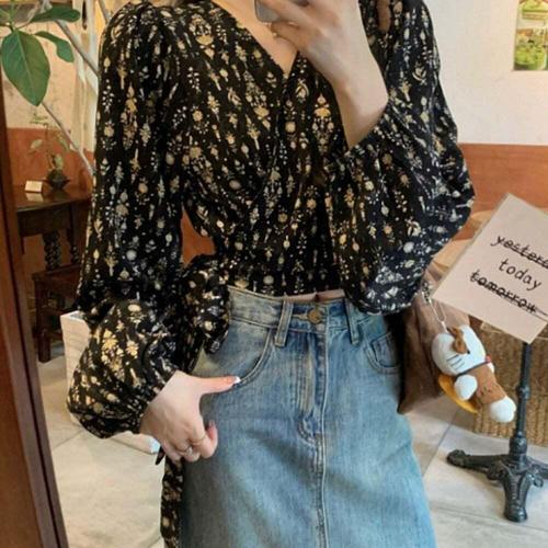 [셀럽하우스]여성 IGHF9351 2컬러 플로럴 랩블라우스 허리리본 퍼프소매