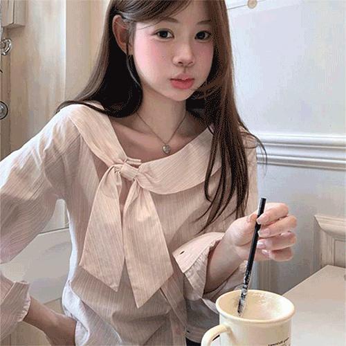[르뚜앙]미소루 봄 가을 리본 타이 스트라이프 핑크 셔츠 블라우스 하객룩 출근룩