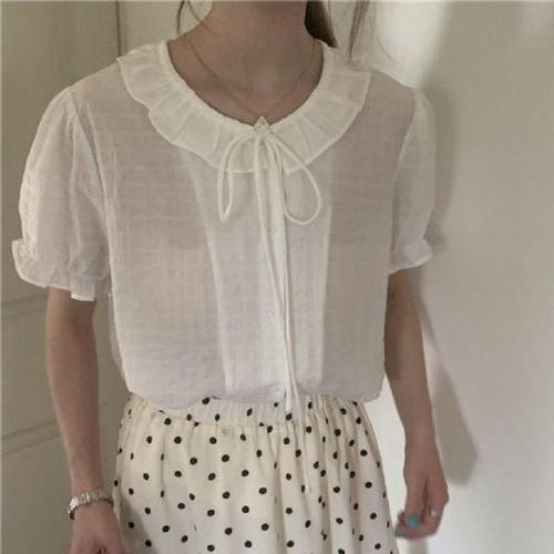 [에이치플러스몰]여성 데일리 하객룩 리본 카라 반팔 고급 블라우스 셔츠