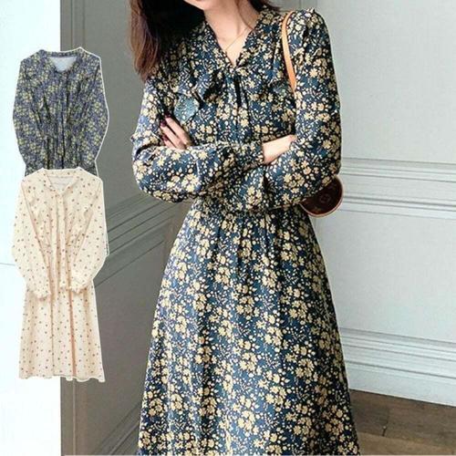꽃무늬 원피스 쉬폰 리본 셔츠 스타일 롱원피스