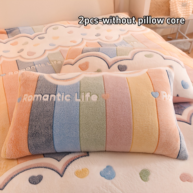 TEMU 무지개 줄무늬 베개 커버 2개 세트 - 부드러운 밀크 벨벳 원단, 파스텔 색상과 환상적인 구름 & 하트 디자인, 사계절 사용 가능, 기계 세탁 가능, 깊은 포켓 침구, 방이나 장식용 선물에 완벽함(인서트 없음), 로맨틱 스타일 폴리에스터 커버|베개커버