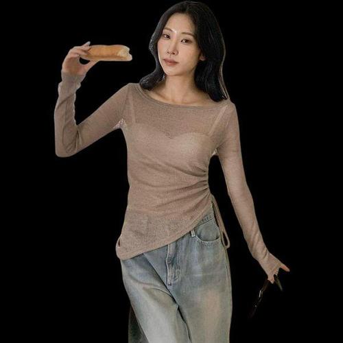[신상오픈런]여성용 슬림핏 긴팔 보트넥 린넨 그물 티셔츠