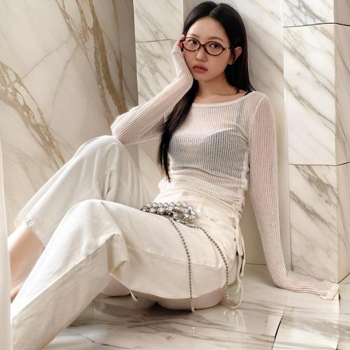 [옷자락]여자 시스루 린넨 스트랩 긴팔 보트넥 티셔츠
