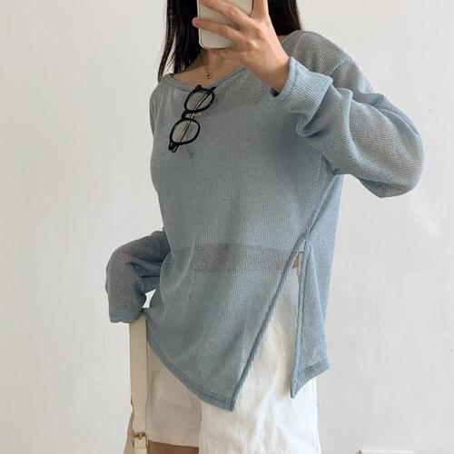 [옷자락]여자 린넨 시스루긴팔 여름 골지 보트넥 슬릿 티셔츠