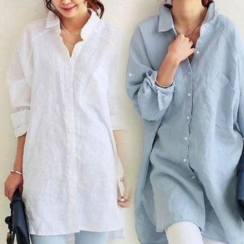 [옷자락]여성용 부드러운 린넨 카라 셔츠 롱드레스