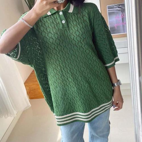 여자 박시핏 배색줄 카라넥 린넨 니트