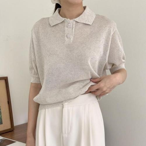 여자 린넨 카라넥 보석 단추 세미크롭 니트