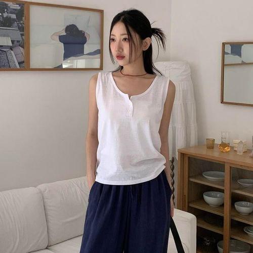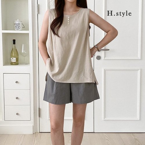 [옷자락] 여자 면혼방 린넨 단추 오버핏 민소매 나시티