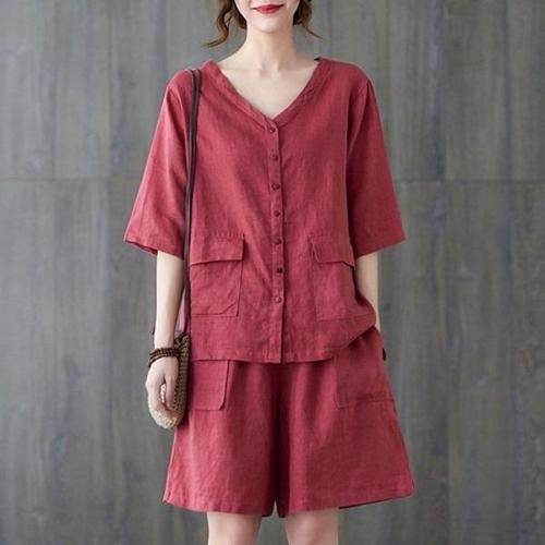 [엄지척]여성 여름 린넨 브이넥 반팔 셔츠 상하 반바지 세트_19557025_667501