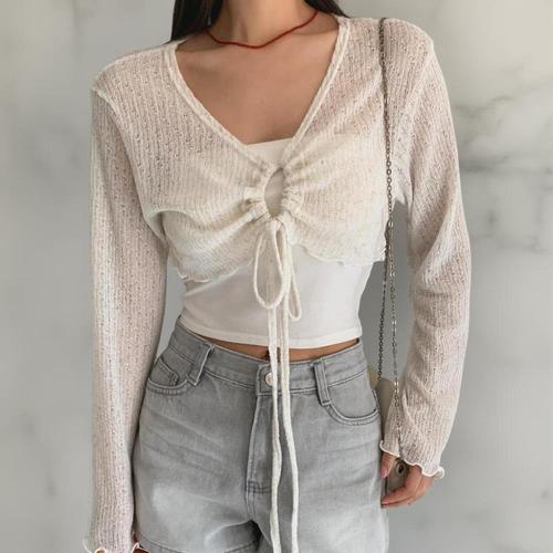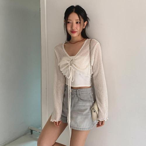 [옷자락] 여성 린넨 트임 스트랩 부클 크롭 짧은 가디건