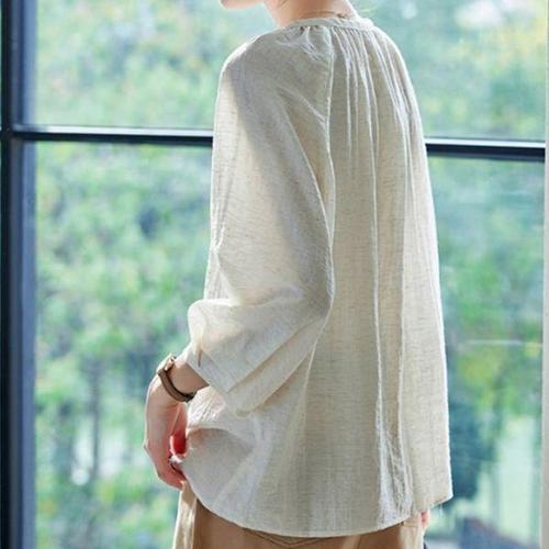 [신상오픈런]여성 여름 린넨 버튼 트임 노카라 블라우스