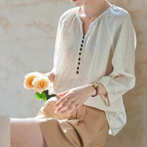 |CCH3E9E|여성 여름 린넨 버튼 트임 노카라 블라우스