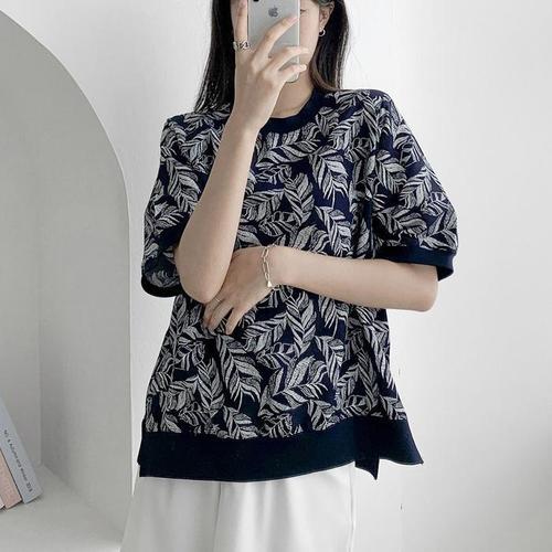 Destijl HC06 린넨 프린팅 양옆트임 품넉넉한 라운드 반팔 시원한 마 티블라우스 D2531BL10I