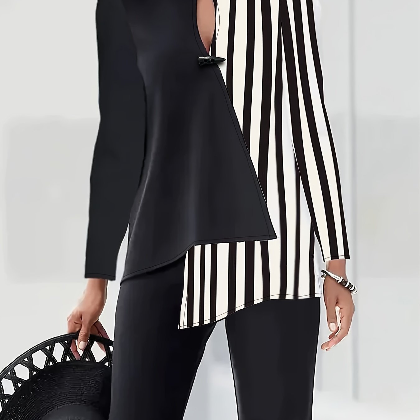 TEMU 플러스 사이즈, 여성용 우아한 긴팔 블라우스 - 오피스부터 파티까지 시크한 블랙 & 화이트 셔츠, 비탄성 구조 소재, 가을/봄 시즌 전문가용 세탁 가능 여성복, V넥 디자인, 비스트레치 패브릭, 스트럭처드 핏, 클래식 , 고급 품질 셔츠, 포멀 셔츠, 패션 여성