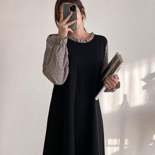 UN 중년여성 라운드넥 린넨 긴팔 원피스 봄 여름 면마 롱 원피스 엄마옷 빅사이즈 40대50대60대