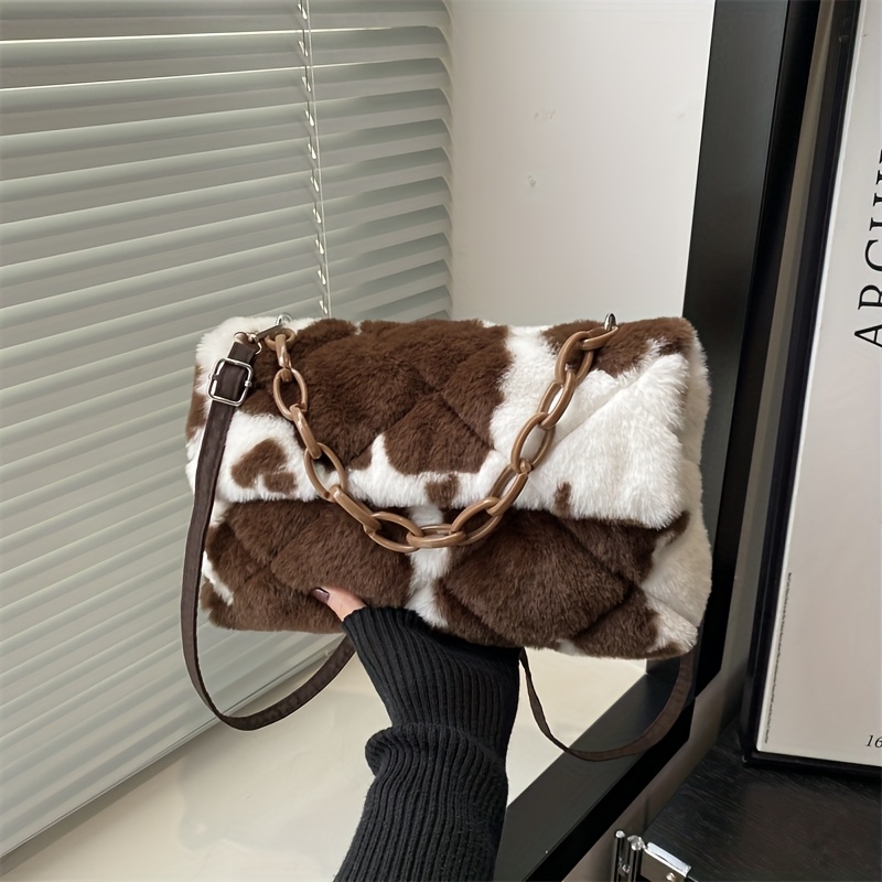 TEMU 여성용 플러시 인조 퍼 동물 프린트 크로스바디 백 - 조절 가능한 체인 스트랩 & 지퍼 클로저, 캐주얼 시크 핸드백, 출퇴근/사무실 필수 가방, 커피 브라운/라이트 브라운, 다용도 패션 액세서리, 부드러운 질감 파우치