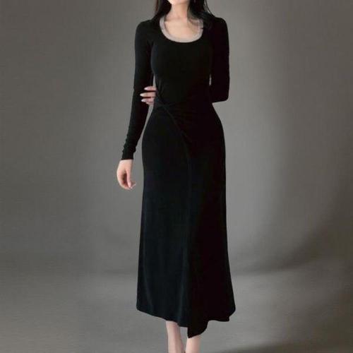 [신상오픈런]여성 배색 U넥 긴팔 트위스트 롱 드레스