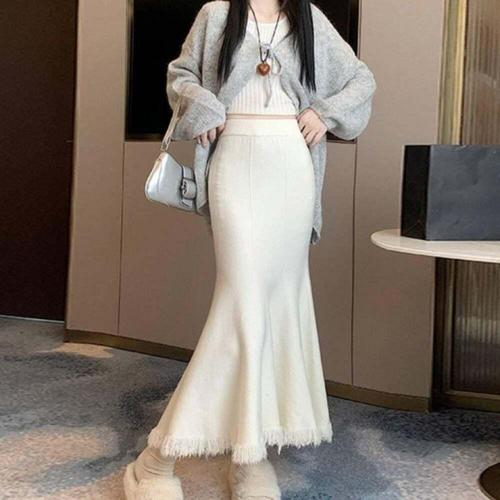 [오너클랜]인기상품 여성용 3색 밑단 수술 장식 니트 머메이드 라인 스커트 [WFLHTX5_260227]