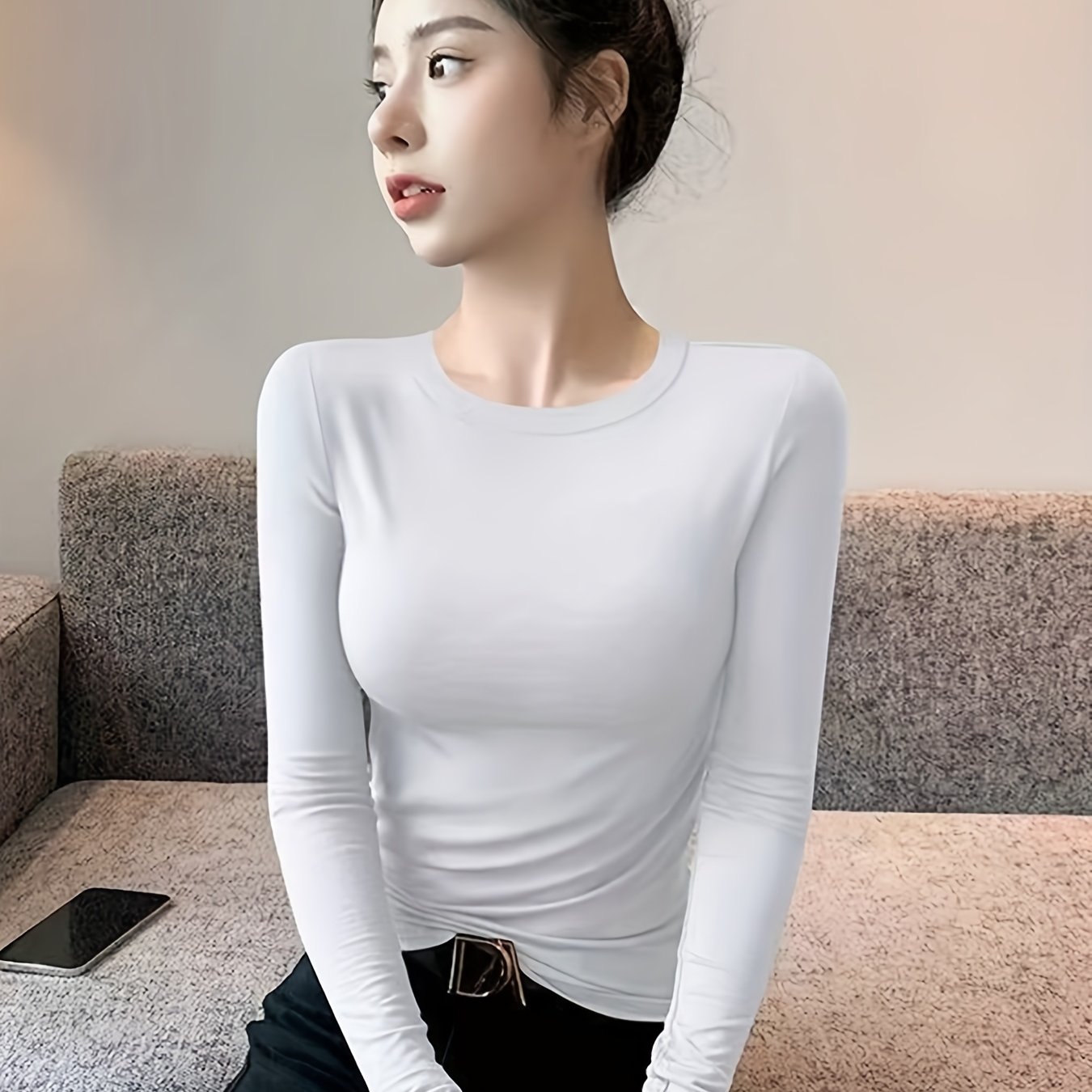 TEMU 우아한 다용도 여성 긴팔 블라우스 - 화이트 라운드넥 단색 셔츠, 세탁기 및 드라이클리닝 가능, 사계절 착용, 청소년 & 성인용, 오피스 & 캐주얼룩, 스타일리시 유쾌한 의류, 쉬운 관리 디자인 탑