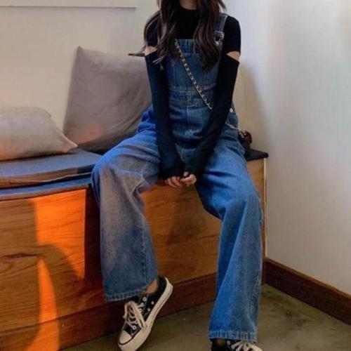 여성 키치무드 넓은 서스펜더 진 어깨끈 오버롤 팬츠