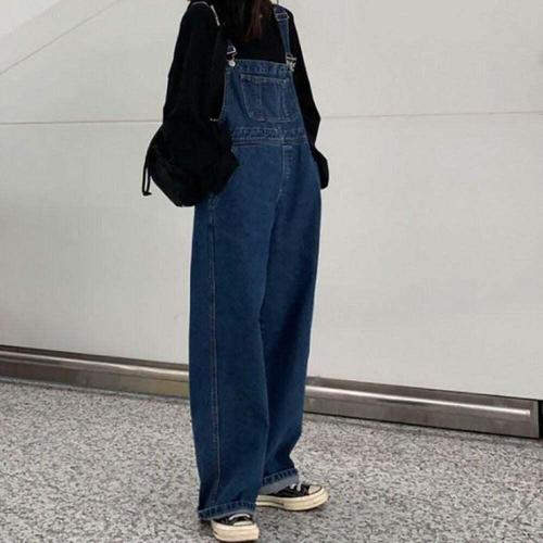 여자 귀여운 데님 청 멜빵 오버롤 와이드핏 팬츠