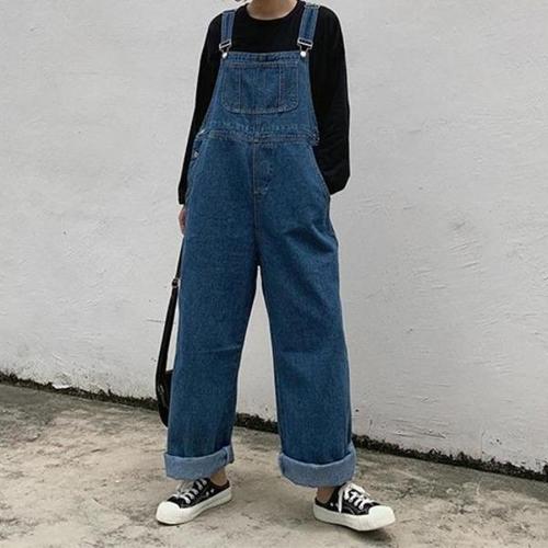 여자 와이드 귀여운 스타일 데님 통 멜빵 바지