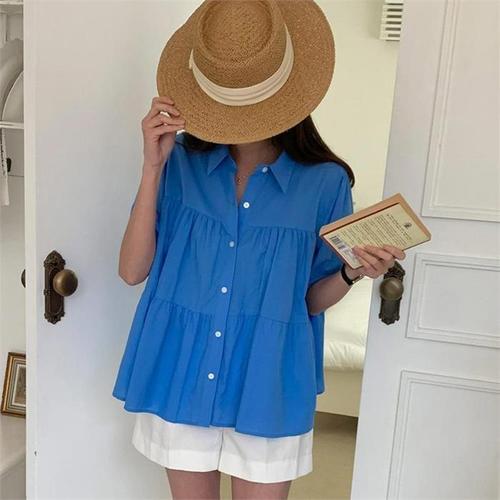 [다잇템]여자 면원단 캉캉 티어드 반소매 남방 블라우스 (9987926A)