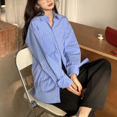 [셀럽하우스]여성 HSHE5522 블루 프리사이즈 모던 오버핏 스트라이프 셔츠