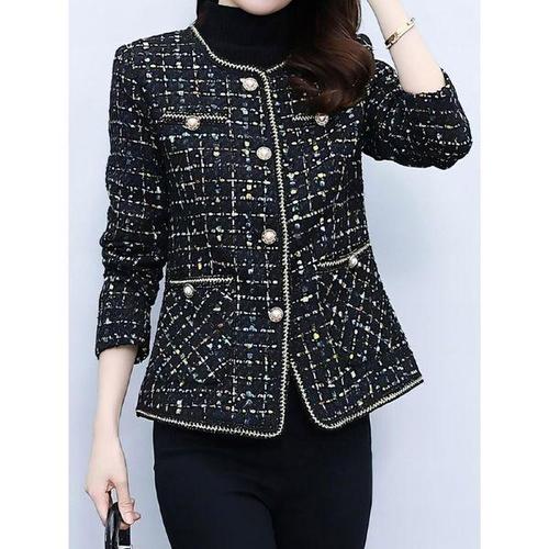 빈티지 여성 트위드 코트 격자 무늬 프린트 더블 브레스트 캐주얼 버튼 봄 슬림 피트 플랩 포켓 공식 레이디 블레이저