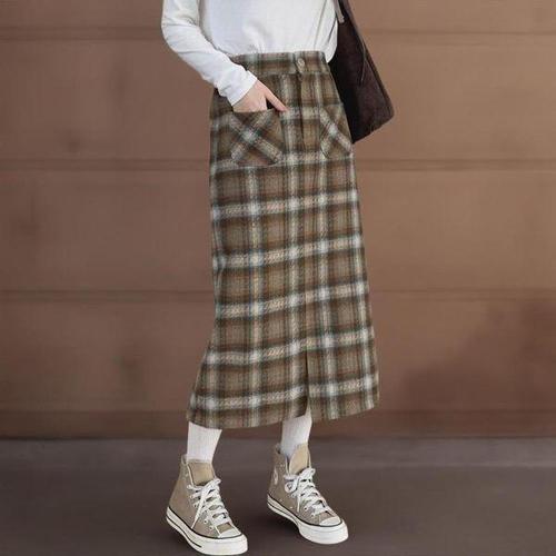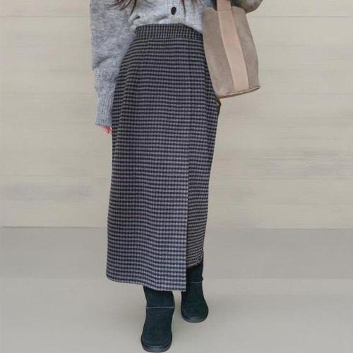 [신상오픈런]여성 체크 패턴 롱 스커트 일자핏 밴딩 모직 데일리 룩