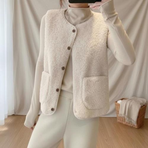 |CCJ6CA1|여성 루즈핏 따뜻한 뽀글이 양털 라운드넥 버튼 포켓 조끼