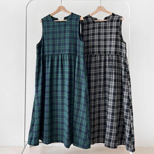 [옷자락]여자 가을 데이트룩 속기모 민소매 체크 롱원피스