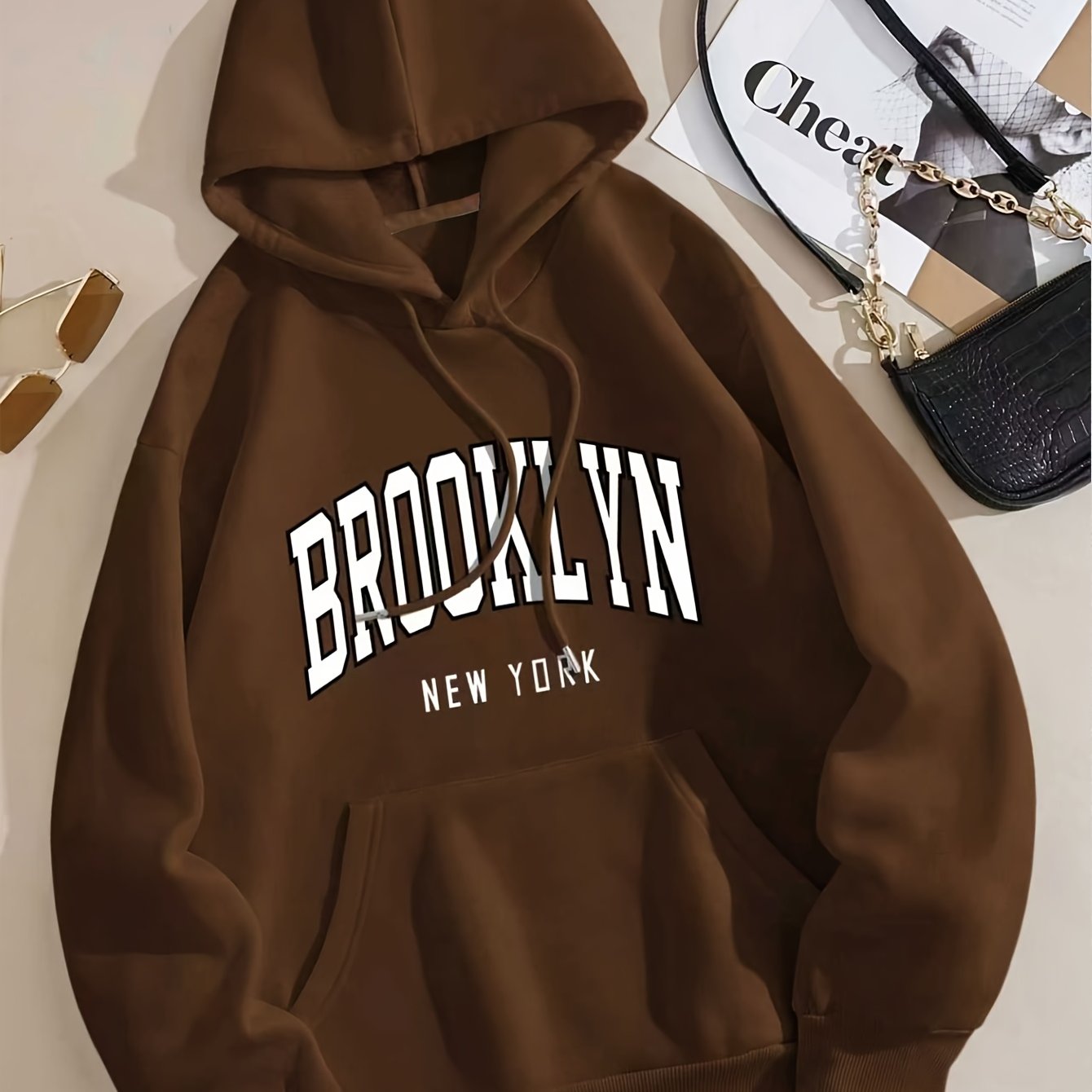 TEMU KCVR 브루클린 & 뉴욕 알파벳 프린트 여성 후드 풀오버 스웨트셔츠, 부드럽고 약간의 스트레치, 패딩 처리, 캐주얼 칼리지 스타일, 포켓 및 드로스트링 포함, 가을 겨울 데일리룩을 위한 프레피 디자인