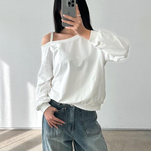 [옷자락] 여자 언발 끈 원숄더 박시 오버핏 무지 면긴팔 맨투맨