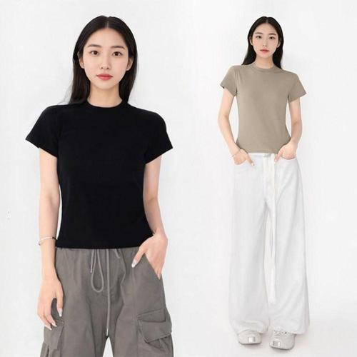 [오너클랜]인기상품 여자 기본 면티 크롭 반팔 티셔츠 U넥 스판 실켓 무지 5부 반팔티 [WFJ2B7J_260227]