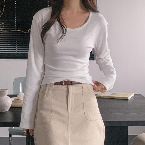 [신상오픈런]여성 유넥 슬림핏 기본 긴팔 티셔츠 스판 무지 (45899725)