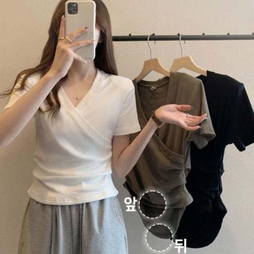[오너클랜]인기상품 여성용 무지 브이넥 반팔 티셔츠 랩 셔링 스판 여름 흰색 기본 티 [WFLHT9N_260208]