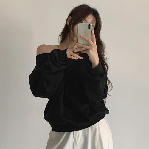 옷자락 / 여자 원숄더 오버핏 겨울 기모티셔츠 무지 면 맨투맨