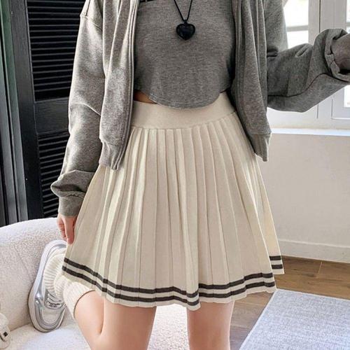 배색 카라 니트 플리츠 스커트 셋업 여성 가을 겨울