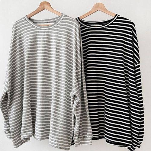 [옷자락]여자 줄무늬 빅사이즈 V넥 반소매 SS 미니멀리즘 니트