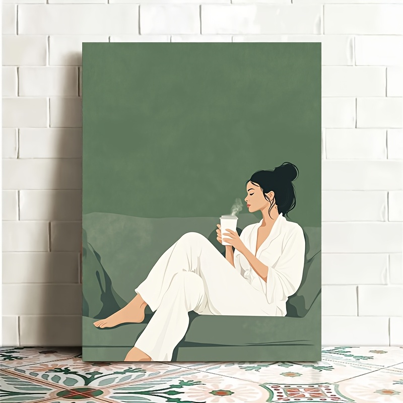 TEMU 2D 평면 액자 캔버스 벽 장식 - 소파에 앉아 커피 마시는 여성, 무드 그린 & 화이트 HD 프린트, 거실·침실·사무실용 준비 완료 홈 데코, 선물 추천, 2D 플랫 아트워크