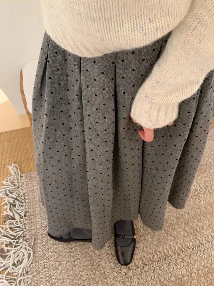 하이 웨이스트 A라인 미디 스커트 여성용 폴카 도트 하트 모양의 하프 바디 스커트 슬리밍 다용도 가을 겨울 캐주얼 스커트