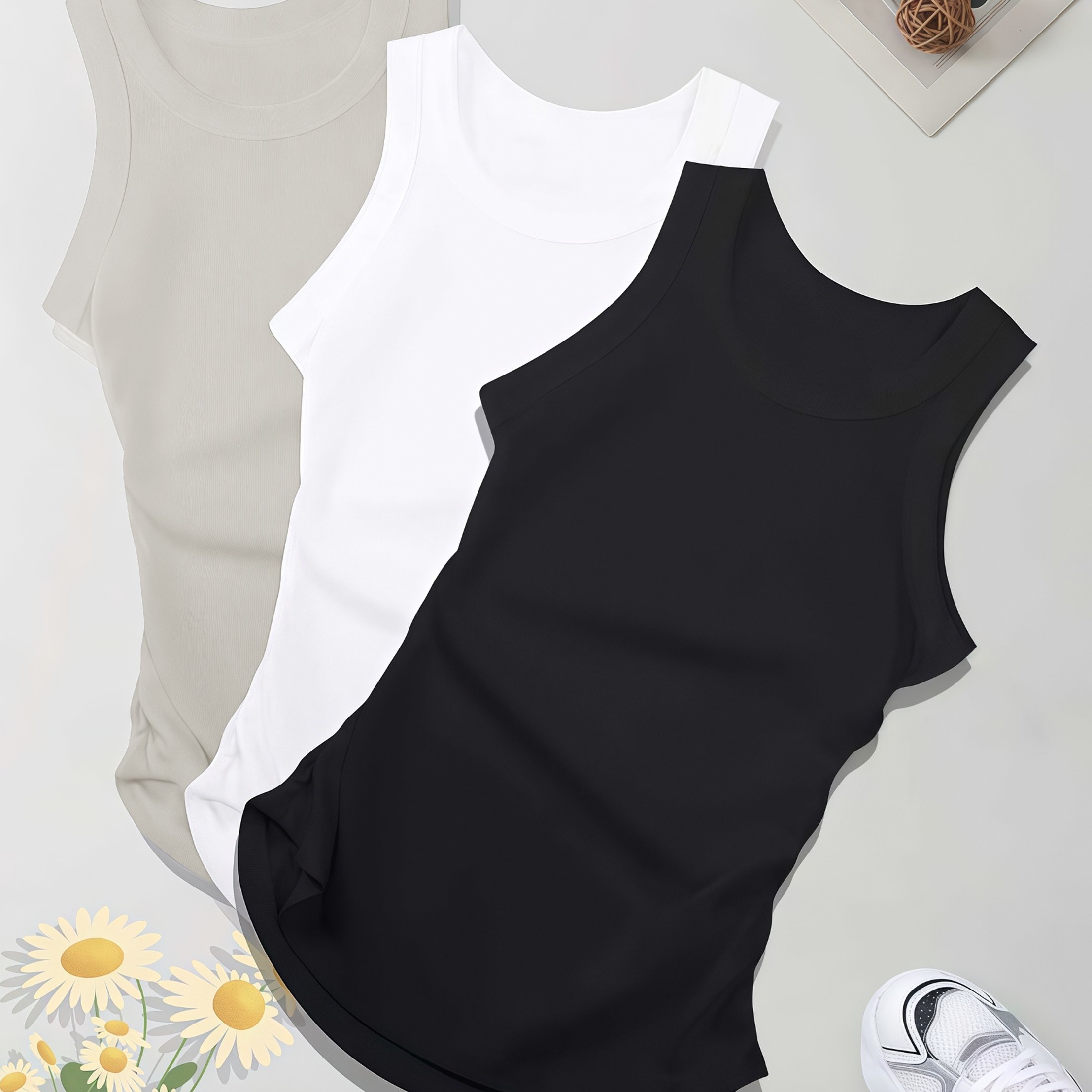 TEMU 3pcs 여성용 캐주얼 통기성 민소매 탱크탑 - 부드러운 스트레치 라운드넥 짧은 길이 탑, 단색 (블랙/다크 그레이/라이트 그레이) - 세탁기 사용 가능 & 사계절용, 스파이럴 디자인, 편안한 핏