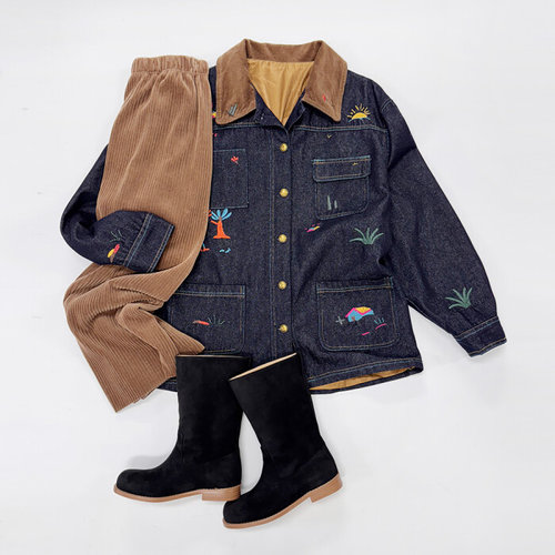 미즈큐즈 / 골덴 카라 배색 자수 오버핏 하프 데님 자켓