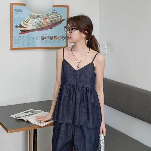 [다잇템_패션]여자 진 면원단 어깨끈 키치무드 티어드 나시티