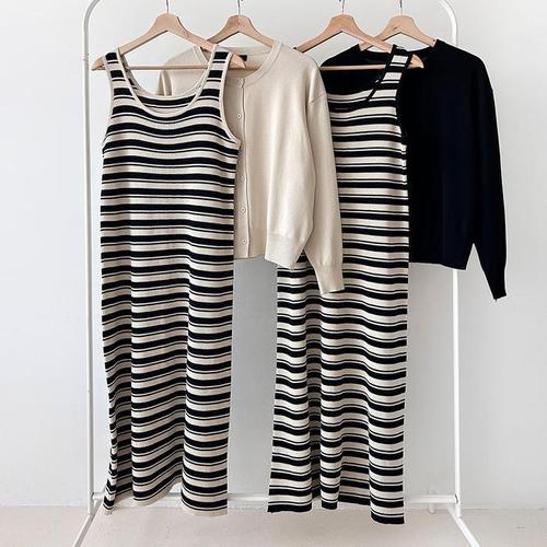 [신상오픈런]여성 스트라이프 유넥 민소매 니트 롱 원피스 가디건 세트 (45899429)